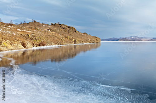 Lake Baikal In December Coastal Rocks Are Reflected In Thin Blue