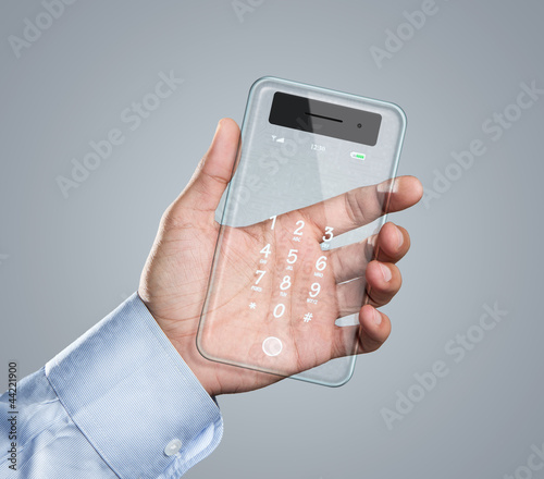 Male Hand Holding Futuristic Transparent Smart Phone Buy This