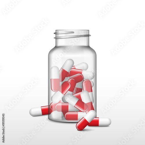 Opened Transparent Medicine Box Or Bottle With Red Capsules