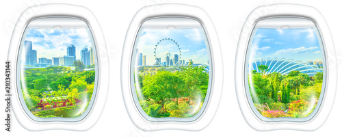 Three Porthole Frame Windows On Aerial View Of Cityscape Singapore And Gardens By The Bay Famous Tourist Attraction In Marina Bay Area Singapore Copy Space On White Background Buy This Stock