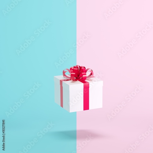 White Gift Box Floating On Blue And Pink Background Minimal