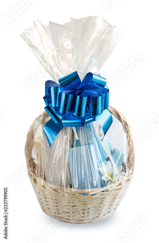 Gift Basket Hamper Packed In Transparent Paper With A Big Blue