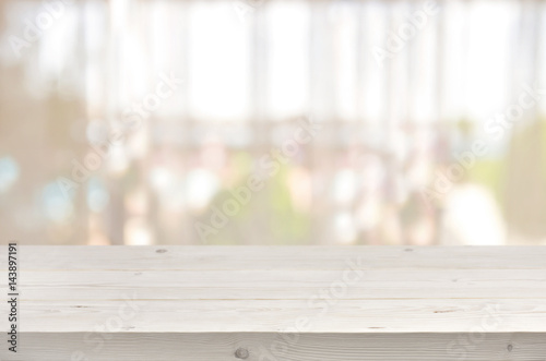 Wooden Table In Front Of Blurred Transparent Window Curtain