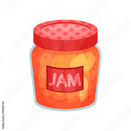 Transparent Glass Jar With Apple Jam Bank With Red Lid And Label