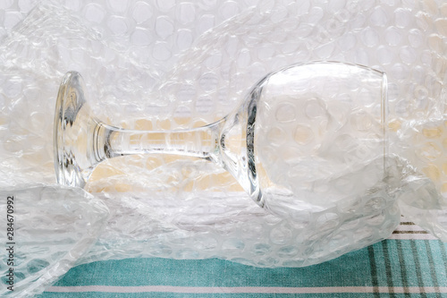 Woman Hands Packaging Transparent Glass Tea Cup With Bubble Wrap