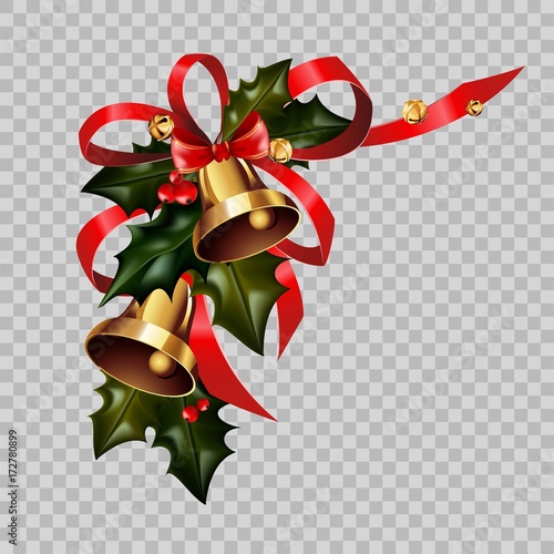 Christmas Decoration Gold Bells On Holly Wreath Bow Vector