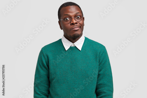 Confused Dark Skinned Stylish Male Looks With Bugged Eyes Purses