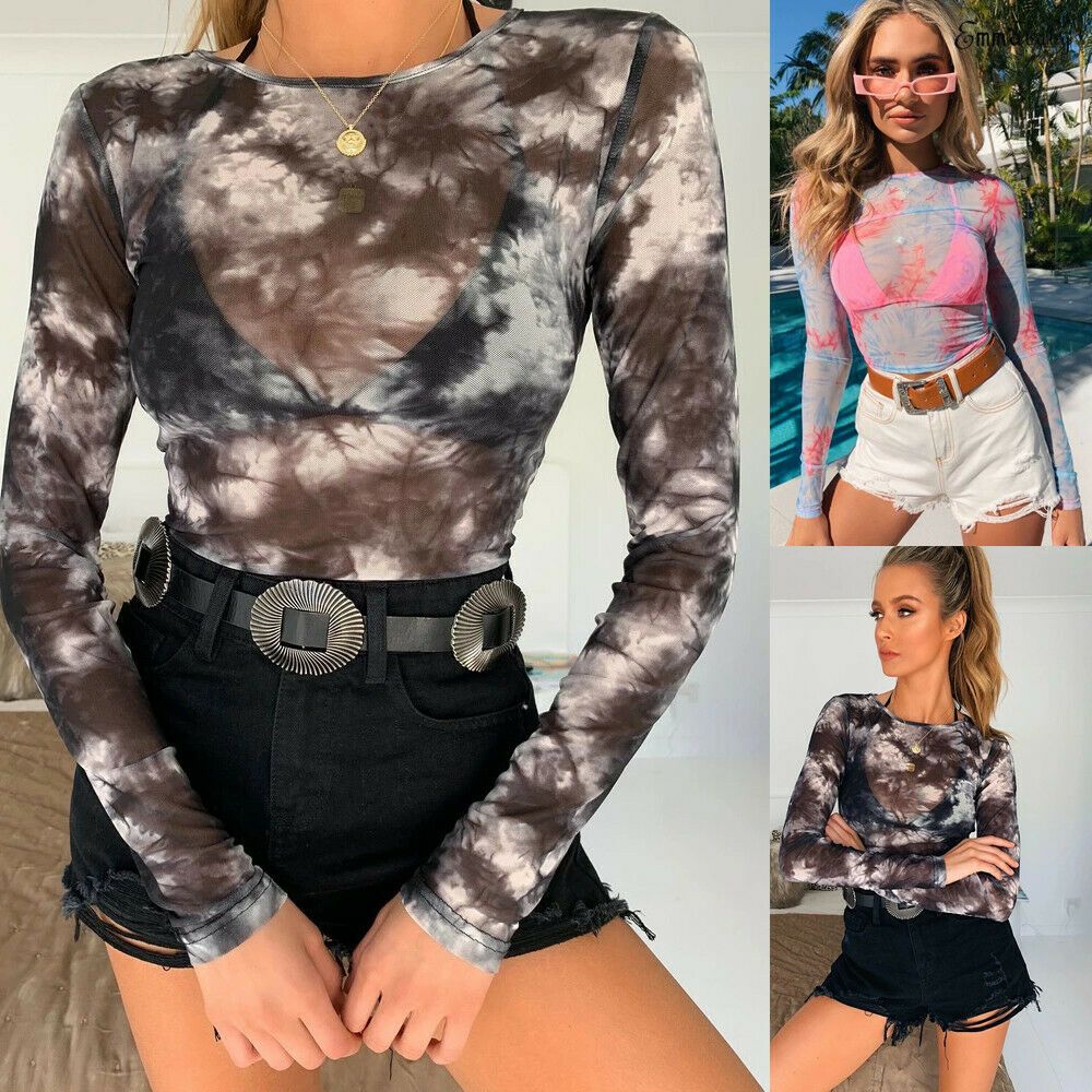2020 Women Printed Round Neck Mesh Tee Shirt Long Sleeve Crop Tops Sexy Transparent Blouse Clubwear Beach