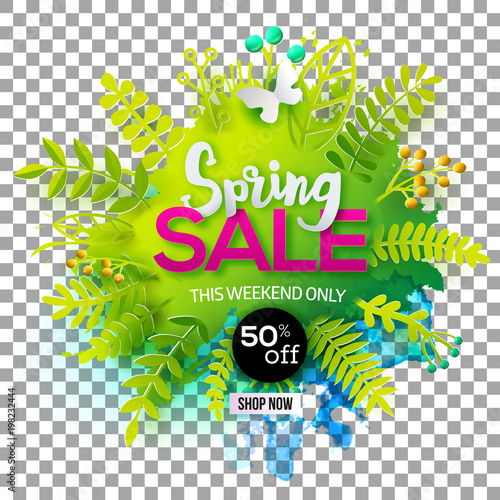 Spring Sale Message On Green Leaves And Watercolor Blot And