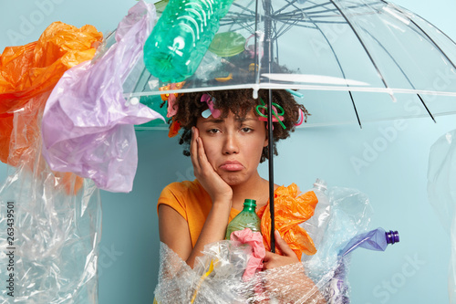 Young Woman Wrapped In Nylon Transparent Bag Trapped Frustrated