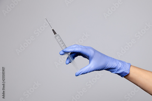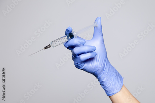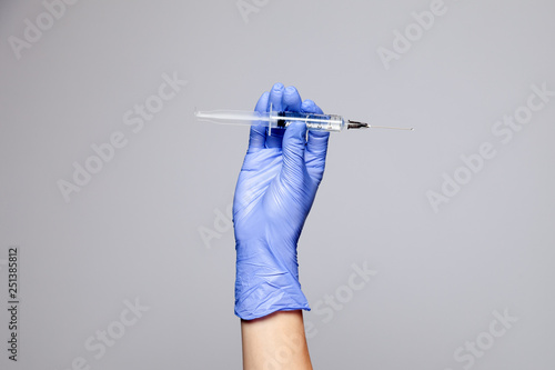 Closeup Doctor Or Nurse Hand In Rubber Latex Medical Purple Glove Holding A Transparent Syringe With Sharp Needle Soncept Rejection Of Vaccinations Hiv Epidemic