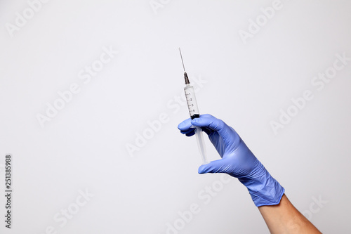 Closeup Doctor S Hand In Rubber Latex Purple Glove Hold Transparent Syringe Isolated On White Background Concept Rejection Of Vaccinations Injection Hiv Epidemic
