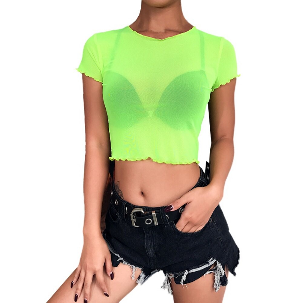 Colorbob Casual Neon Green Mesh Top Female T Shirt Transparent