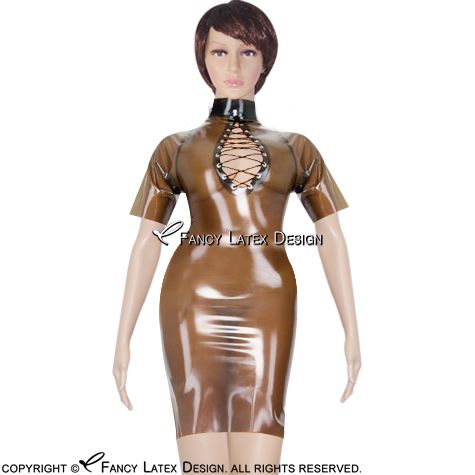 Transparent Brown Short Sleeves Sexy Latex Dress Lacing Front